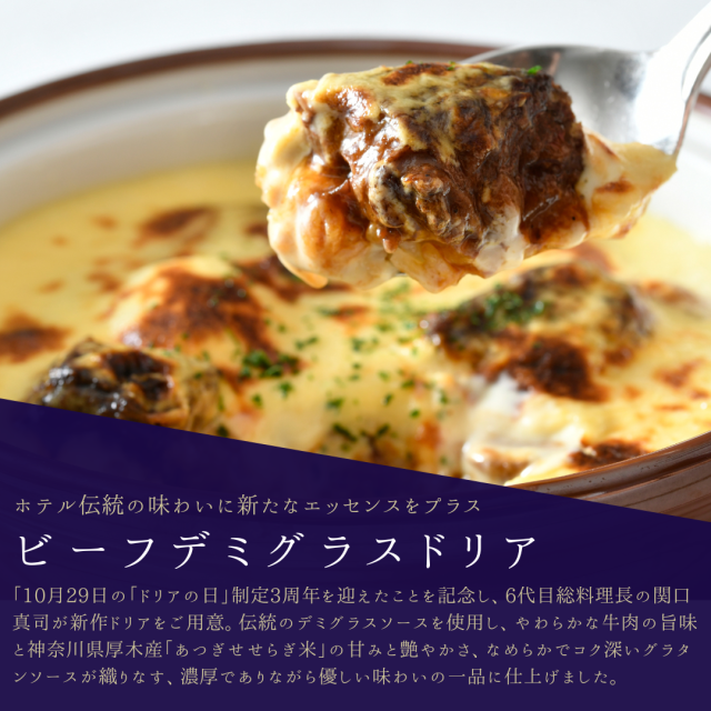 初代総料理長サリー・ワイルが体調のすぐれないお客様からのリクエストを受け即興で創作した“ドリア”は、今や日本中で愛される“洋食の定番メニュー”。そんなドリアの歴史をより多くの方に知っていただくために制定した10月29日「ドリアの日」の3周年を記念して、6代目総料理長の関口真司がアレンジした新作ドリア「ビーフデミグラスドリア」を冷凍食品シリーズの新商品として販売いたします。
