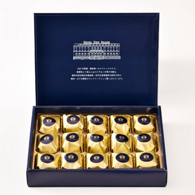 ゴールドの包み紙をまとい、ニューグランドブルーのボックスに並ぶ高級感あるパッケージは、大切な方への贈り物にもおすすめです。